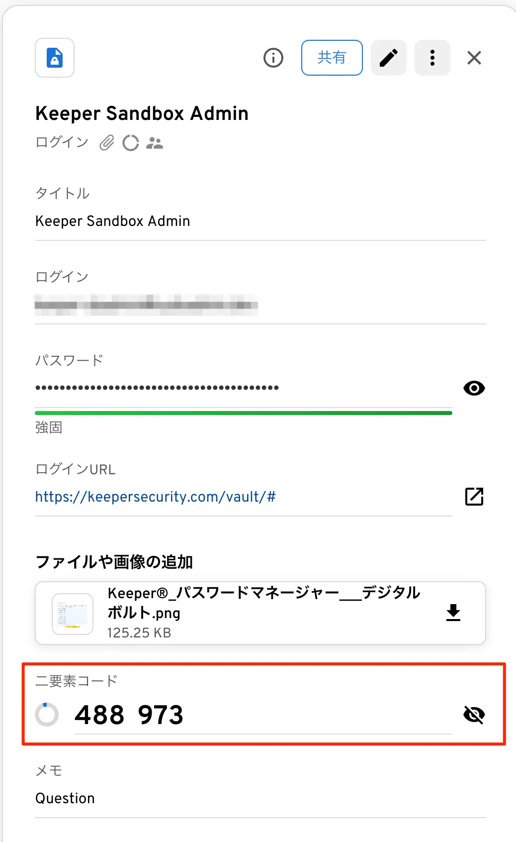 Keeperでは以下のように、TOTP(Time-based One-time Password)の二要素認証コードを格納できます。