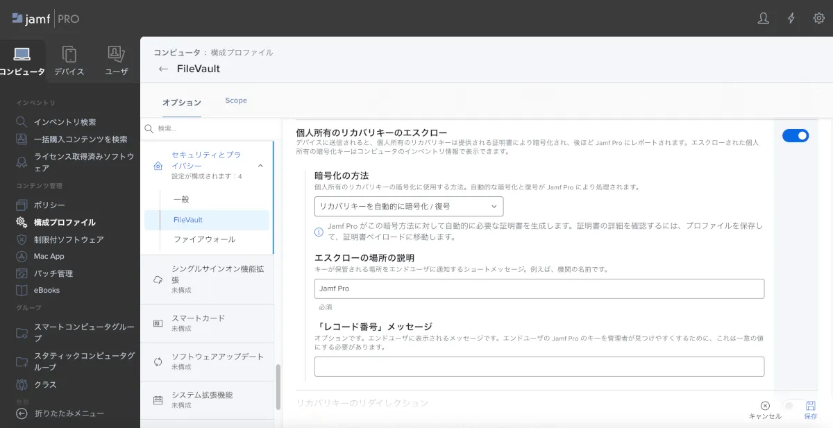 - Filevaultリカバリーキーのエスクロー設定をした構成プロファイルの配布