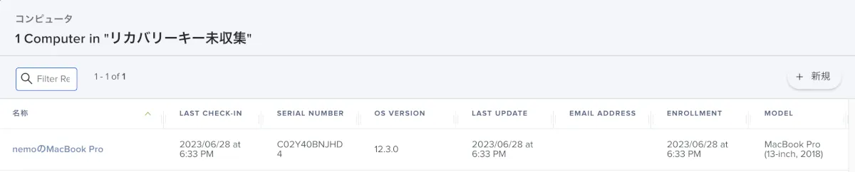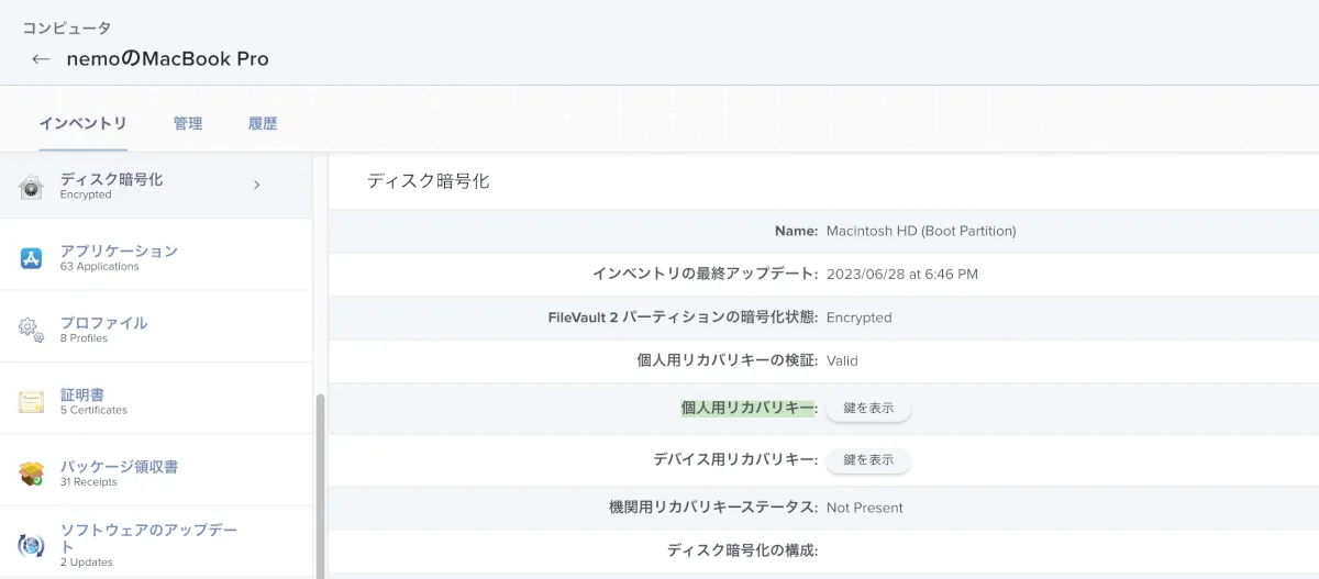 FileVaultによるディスクの暗号化は行われておりますが、リカバリーキーがUnknownとなっています。リカバリーキー未収集のSmart Computer Groupに追加されていることも確認できます。