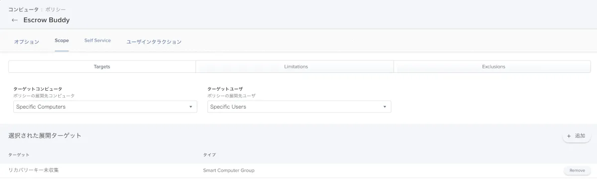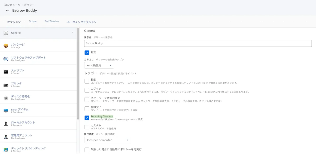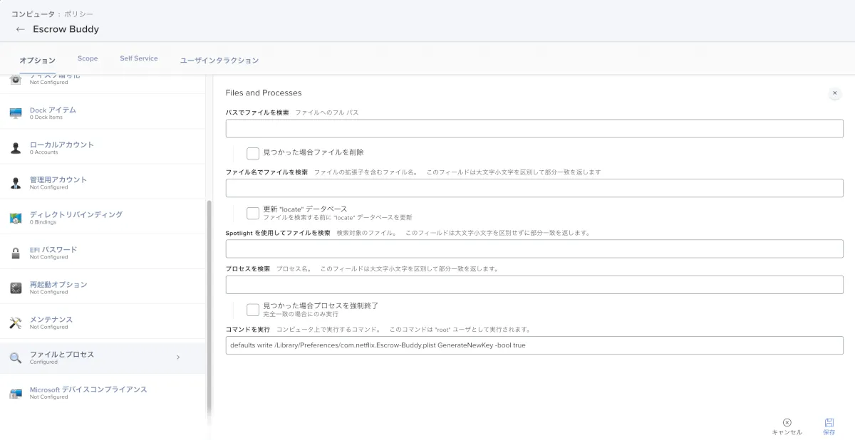 - Escrow Buddy配布の&次回ログイン時にリカバリーキーを再発行する設定用のポリシーを作成します。