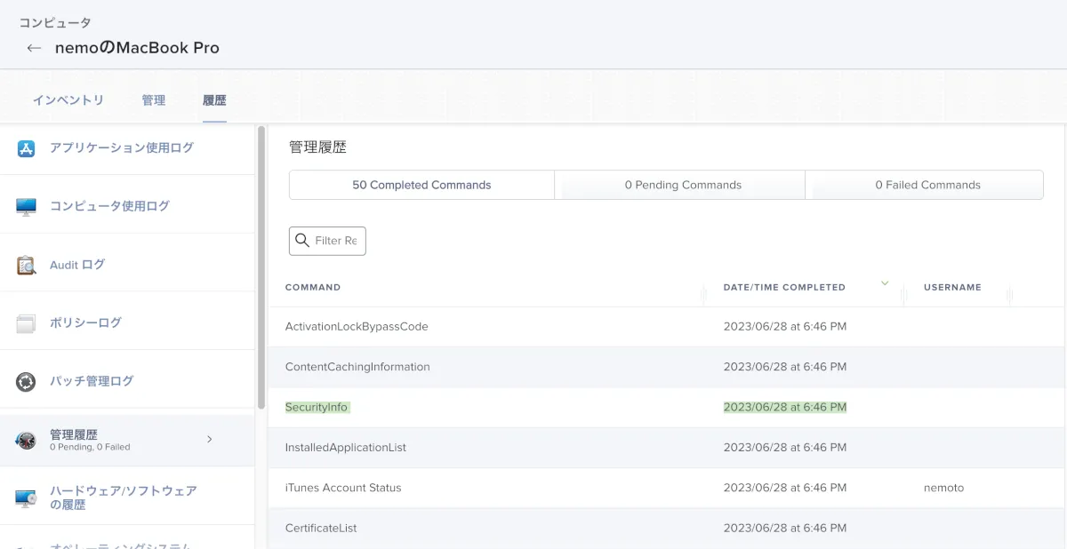 再ログインまたは再起動をしてみます。前述の注意書きの通り、この時点ではまだアップロードされないため、SecurityInfo MDMコマンドが実行されるのを待つか、Mac側のターミナル.appにてsudo jamf reconを実行し、SecurityInfoコマンドが実行されたことを確認します。