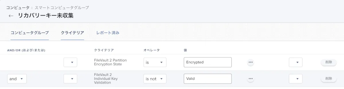 これでFileVaultが有効になっているがリカバリーキーが取得できていないグループが作成されます。登録時の状況などでタイミングを調整したい場合はLast Check-InやLast EnrollmentのCriteriaを随時追加してください。