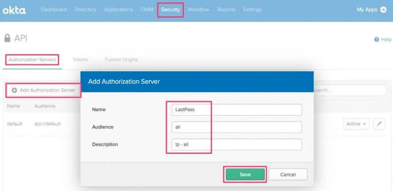 次にAuthorization Serverの作成を行います。OktaのSecurity -> APIのAuthorization ServersタブからAdd Authorization Serverを押します。下記のように入力してSaveします。