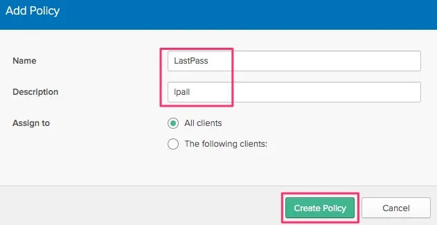 引き続きAuthorization Serverの設定でAccess PoliciesタブからAdd Policyします。NameにLastPassと入れてDescriptionは適当に作成します。