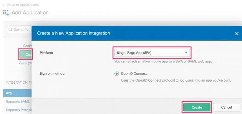 Oktaの管理画面でApplicationからAdd Applicationします。検索せずにCreate New Appから作成します。PlatformでSingle Page App (SPA)を選択してCreateします。