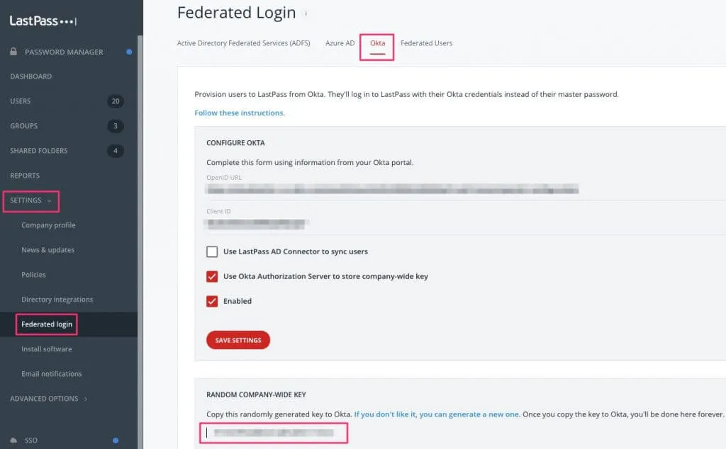 LastPassの管理画面に戻りSettings -> Federated loginを開きます。Oktaタブを選択してページ下部のRANDOM COMPANY-WIDE KEYをコピーします。なお、このKeyはリロードするたびに変わるのですが、コピーしたものが表示されなくなっても使えるので気にしなくて大丈夫です。