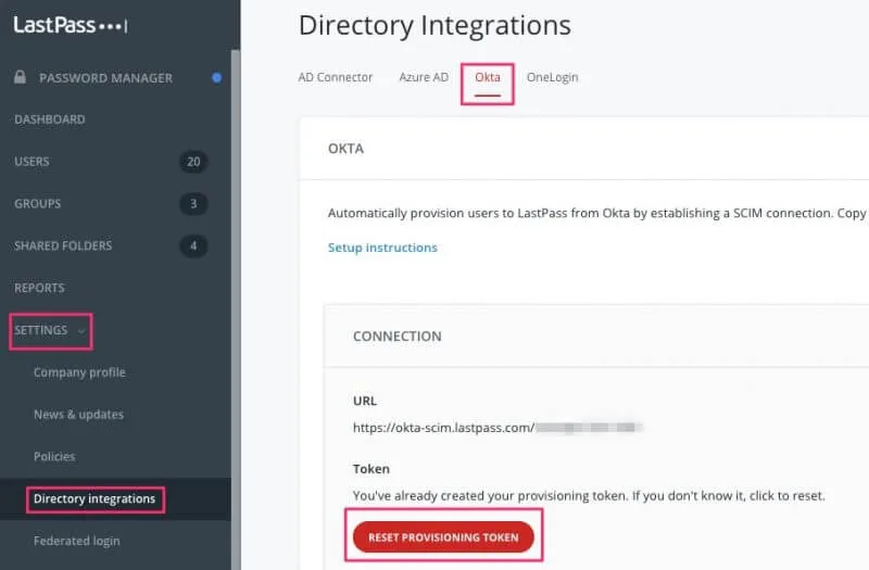 まずLastPassの管理画面から Settings -> Directory integrations へ移動し、Oktaタブを開きます。 表示されているURLを控えます。Create Provisioning Token を押してトークンを発行します。この際、画面遷移するとトークンが表示できなくなるため、必ずこの瞬間に控えておきます。(画像はReset…になっていますが一度発行したあとはこうなります)