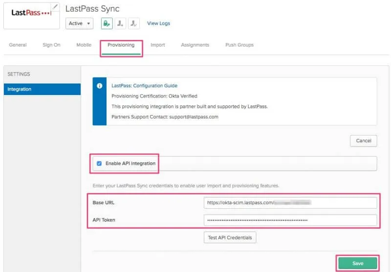 作成したら、LastPass SyncのProvisioningの設定をします。Provisioningタブへ移動してConfigure API Integrationボタンを押してEnable API integrationにチェックを入れ、先ほど控えたURLとトークンを入力してSaveします。