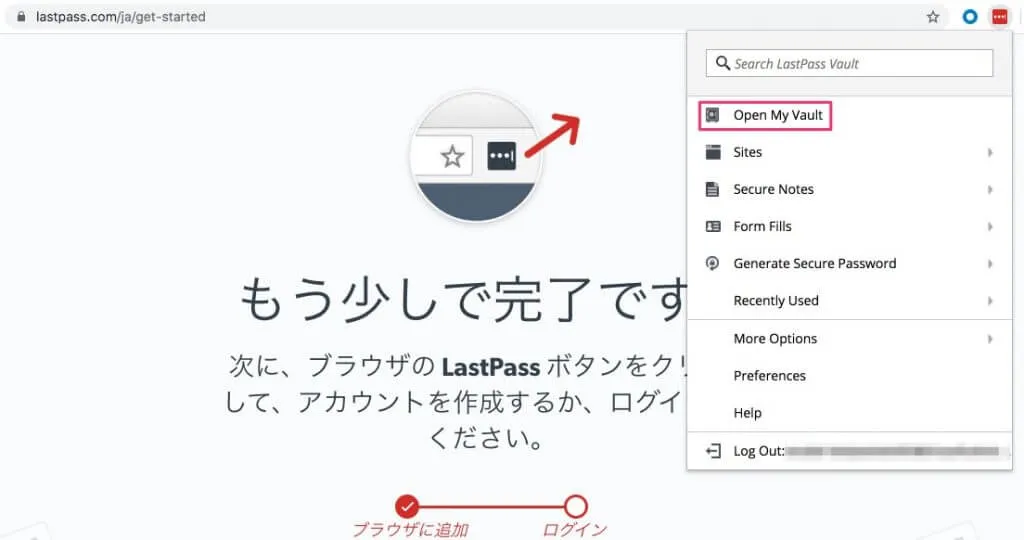 しばらくするとエクステンションの色が灰色から赤に変わって利用できるようになります。Open My Vaultを押せばパスワードを管理するユーザ画面が開きます。