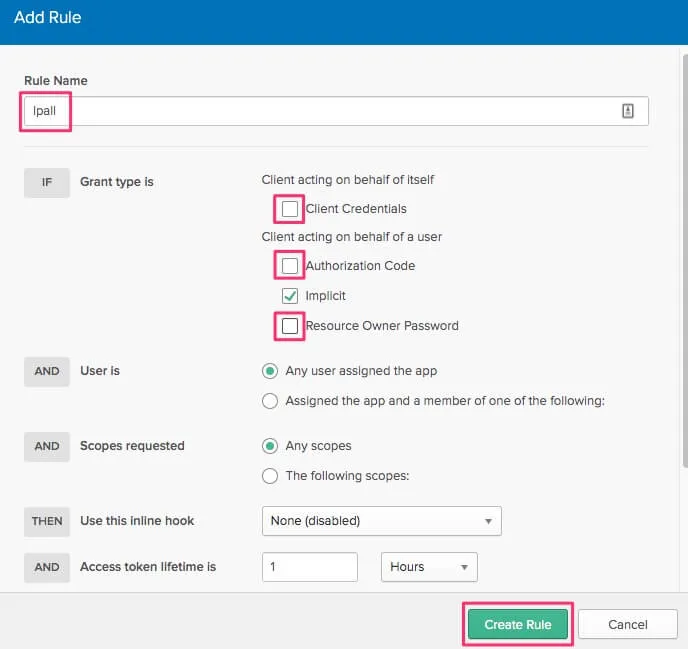 詳細画面でAdd Ruleを押してGrant type isでClient Credentials, Authorization Code, Resource Owner Passwordの3つの項目のチェックを外してCreate Ruleします。Impricitだけが残ります。