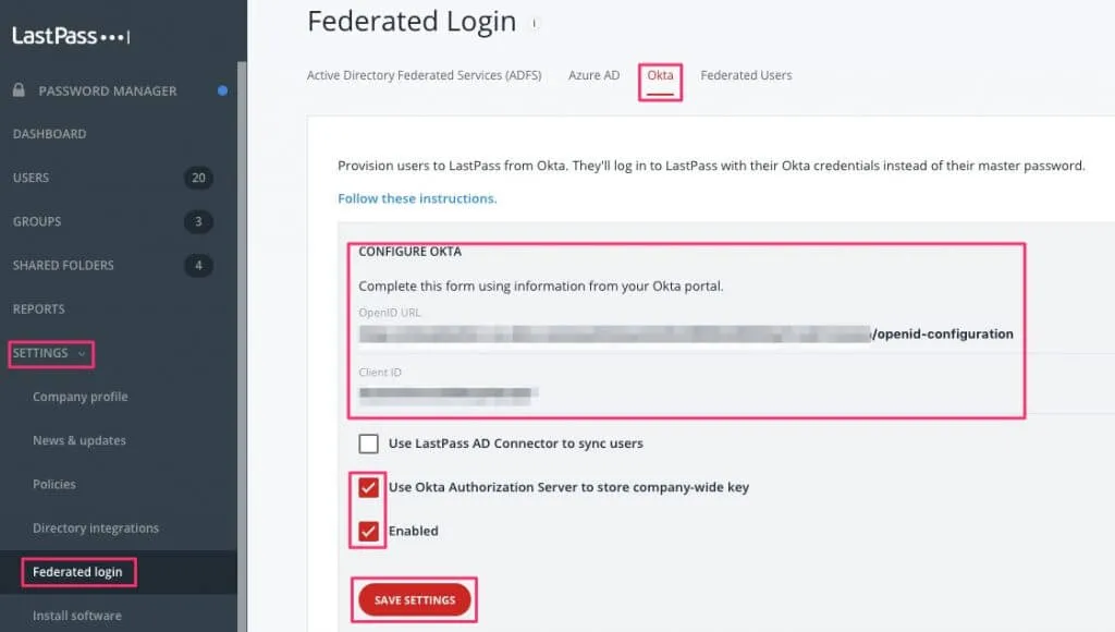 最後にLastPass側でOktaの設定を入れます。