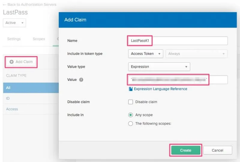 作成したAuthorization ServerにClaimを追加します。ここではLastPass側で発行したKeyが必要になります。この部分が参照しているドキュメントと違う部分があるので要注意です。