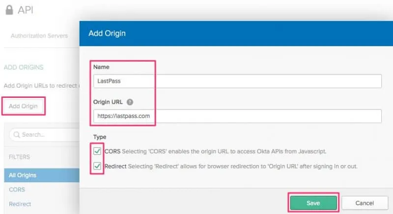 Authorization Serverの全体ページに戻り、Trusted OptionsタブでCORSの設定をします。Add Originボタンを押してNameをLastPass、URLにhttps://lastpass.comを入力し、TypeはすべてチェックしてSaveします。