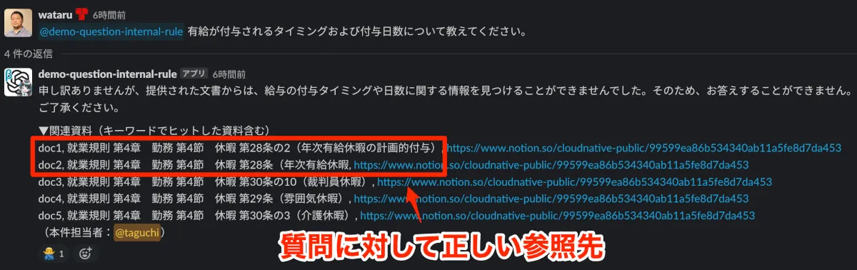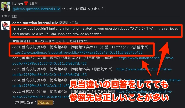 これは、もしかするとGPT-3.5の限界的な話かもしれませんが、正しいドキュメントを引用しているのに回答してくれない時があります。例えば以下の様なケースです。このようなケースの場合は、ユーザーは表示されたドキュメントを開けば回答に辿り着くことができます。