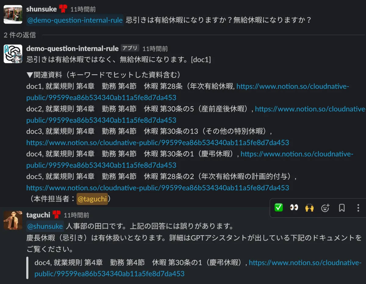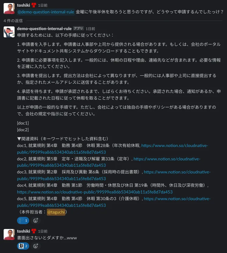 上記のチャットQAボットをクラウドネイティブのSlackに召喚し、有志で集まった従業員の方々に袋叩きにしてもらいました。
