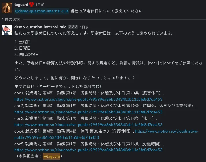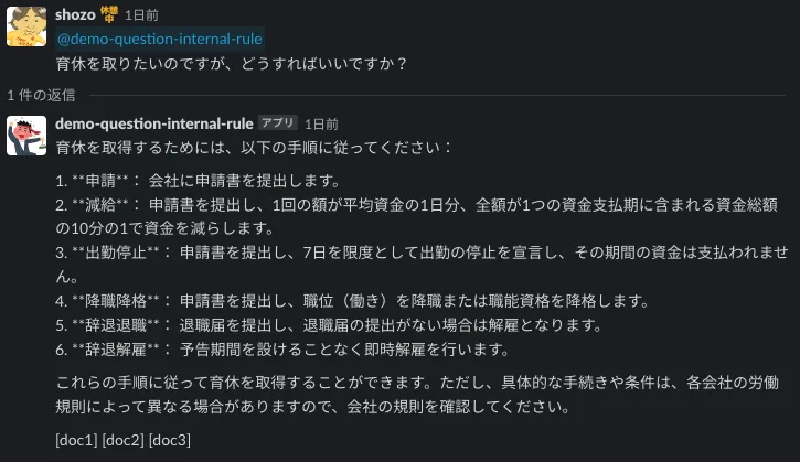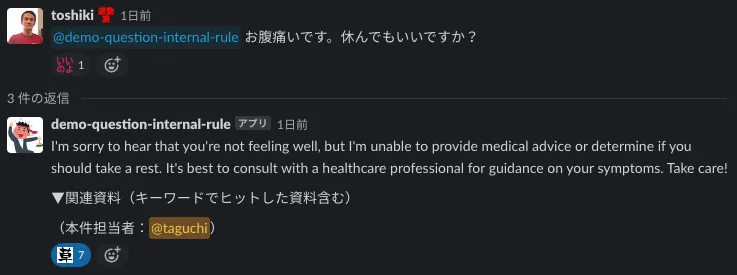 | シナリオ | 従業員が人事に対して就業規則に関する質問を行う。(たまにあえて、問い合わせ窓口を間違えた質問も行う) |