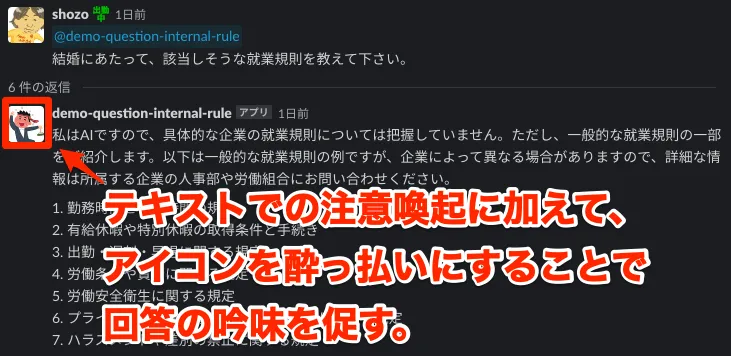 その手段は沢山ありますが、1つのアイデアとして、テキストでの注意喚起に加えて、アイコンを酔っ払いにすることで回答の吟味を促すという方法があるかと思いました。酔っ払いの人から何か教えを受けても、みなさん半信半疑になりますよね…..?