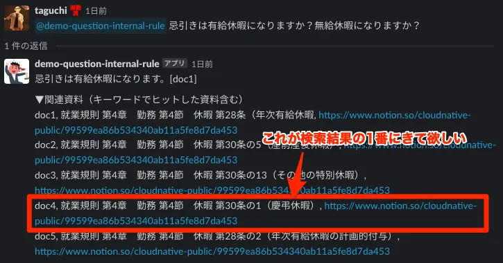 今回5つ表示させているドキュメントは関連度順に並んでいますが、やはりキーワード検索では一番欲しかったドキュメントが上にこないケースがあります。この辺は、セマンティック検索やベクトル検索を用いて改善の余地はありそうだなと思いました。