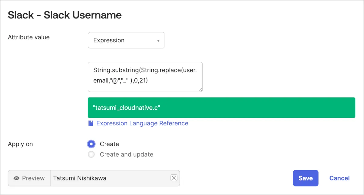 例えばSlack usernameは21文字以下尚且つ@マークは利用できないという条件があります。そのためAttribute Mappingsでは以下のように@マークを_に変換しつつ先頭から21文字までを取得するように設定をしています。