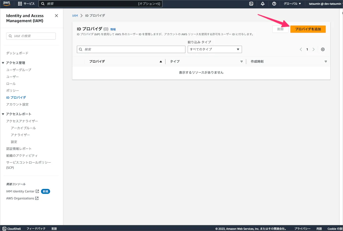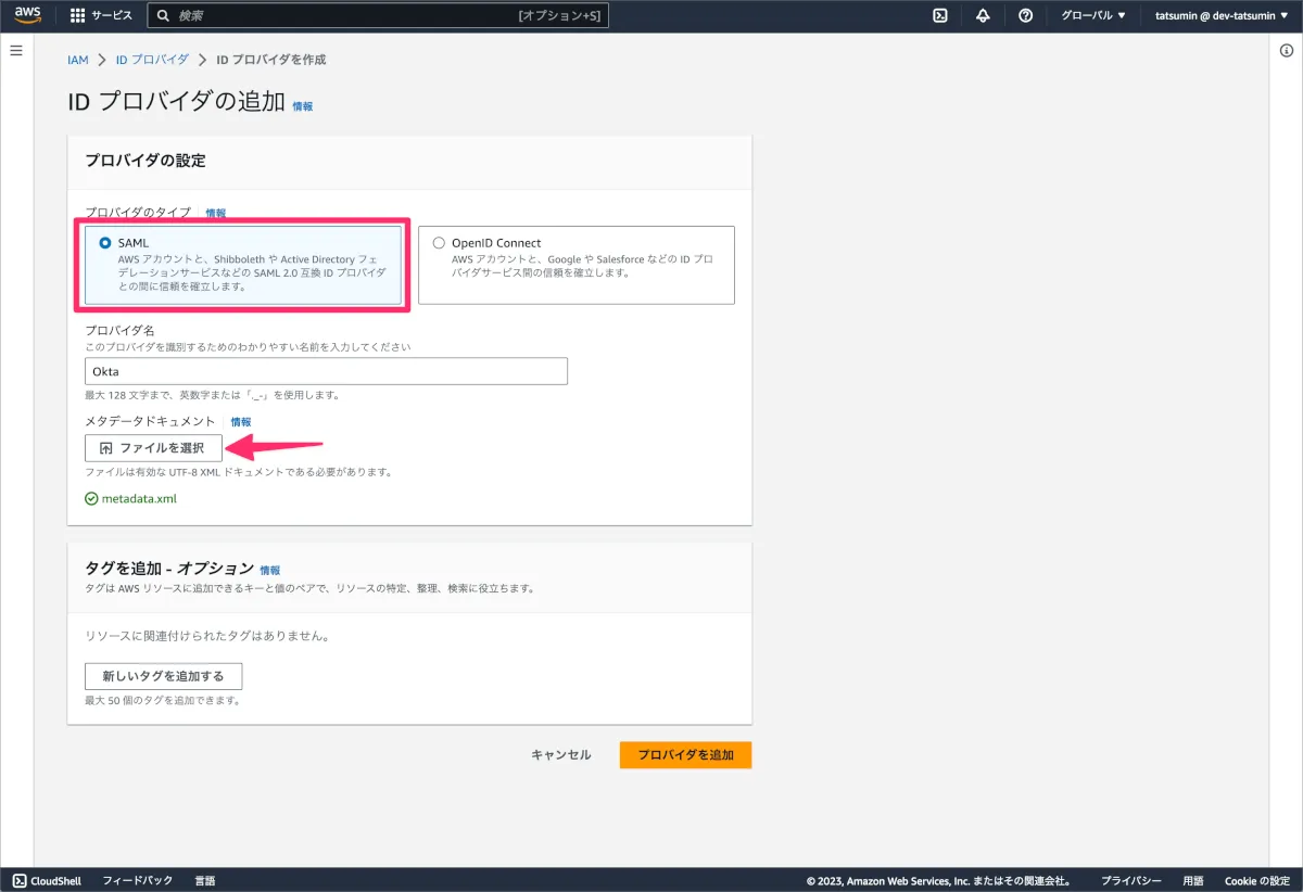 - プロバイダのタイプをSAMLを選択し、プロバイダ名はOktaなどわかりやすい名前を入力します。