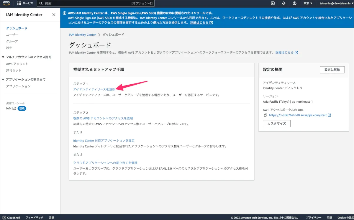 - 表示される推奨されるセットアップ手順のステップ1 アイデンティティソースを選択をクリックします。