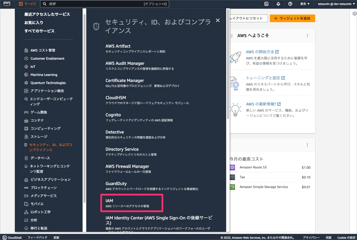 - AWSマネジメントコンソールにアクセスし、サービス>セキュリティ、ID、およびコンプライアンスからIAMをクリックします。