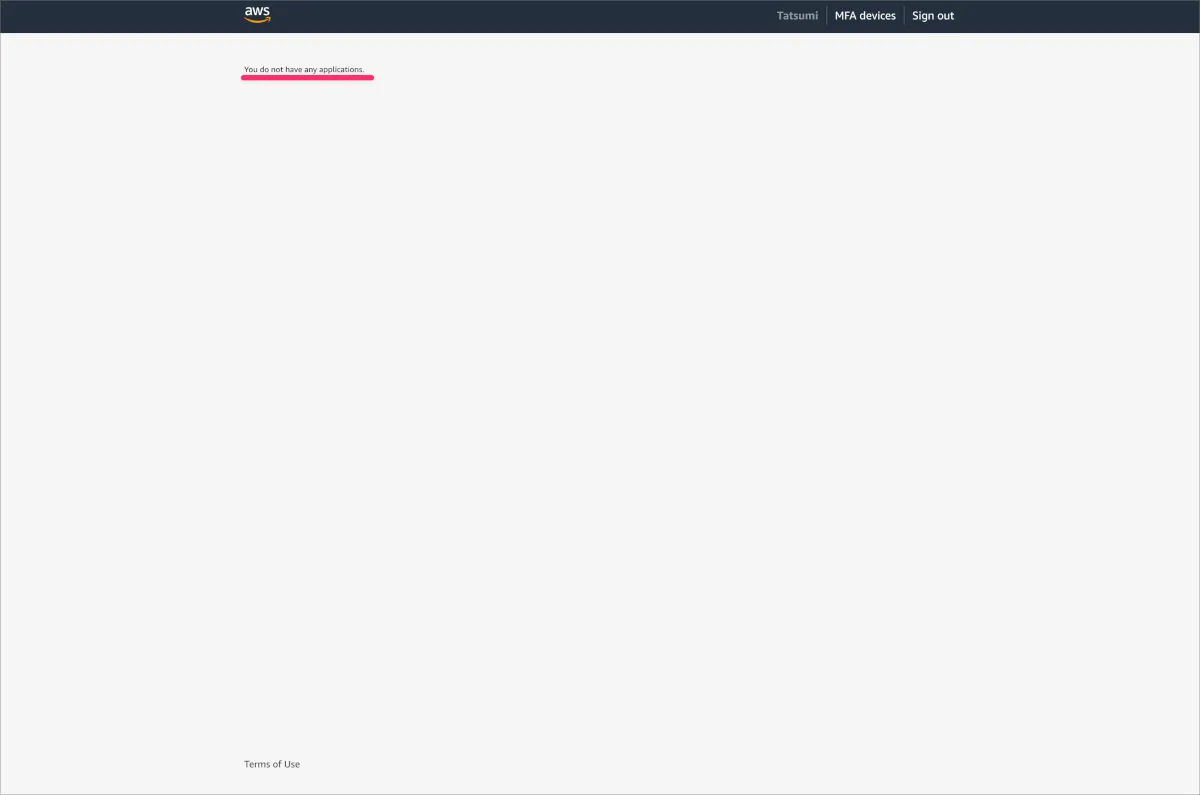 実際にこの段階ではOktaからSSOを実施するとSSO自体は成功しますがAWS側で利用できるリソースがないため以下のようにYou do not have any applicationsと表示されます。