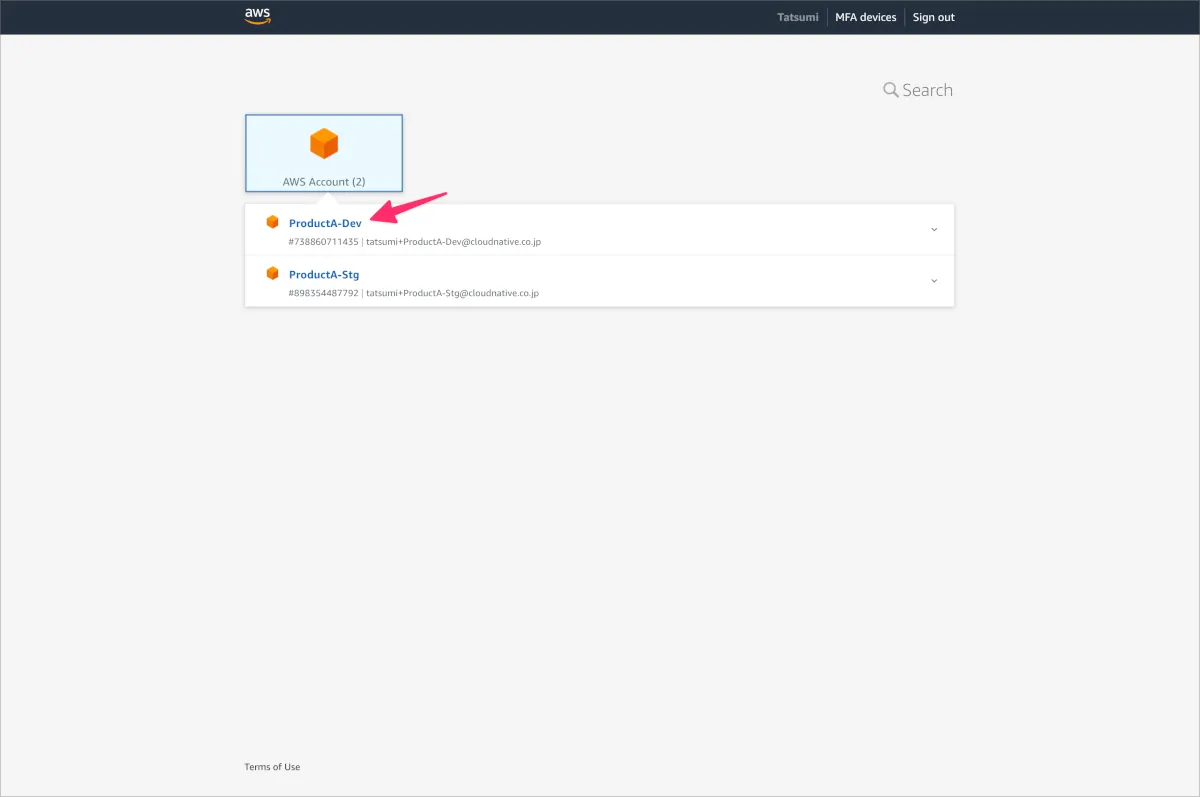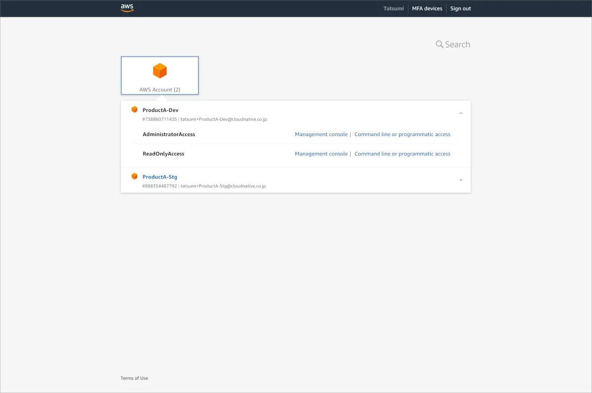 ここではあらかじめプロダクトごとに開発環境、ステージング環境、本番環境を想定したAWSアカウントを事前に作成しています。