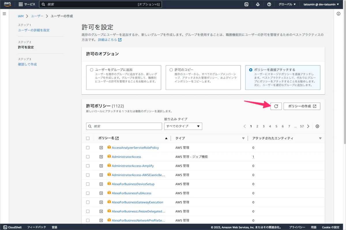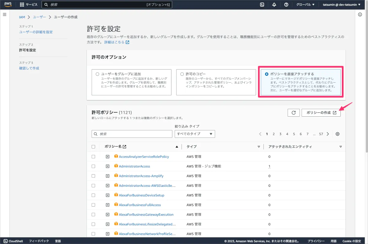 - 許可の設定でポリシーを直接アタッチするを選択し、ポリシーの作成をクリックします。