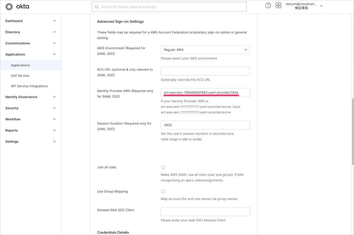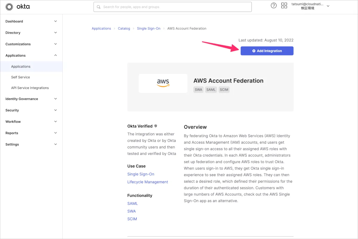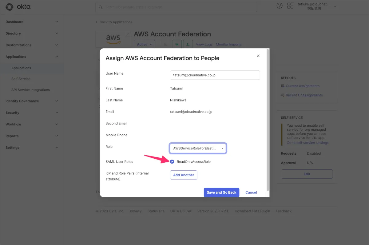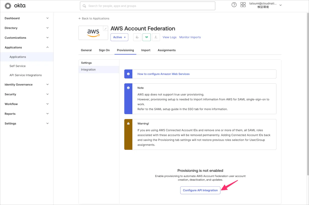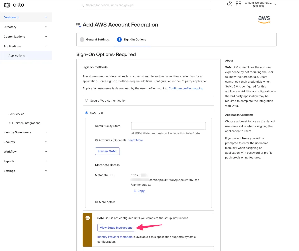 - Okta管理画面のAWS Account Federationアプリの画面に戻ります。