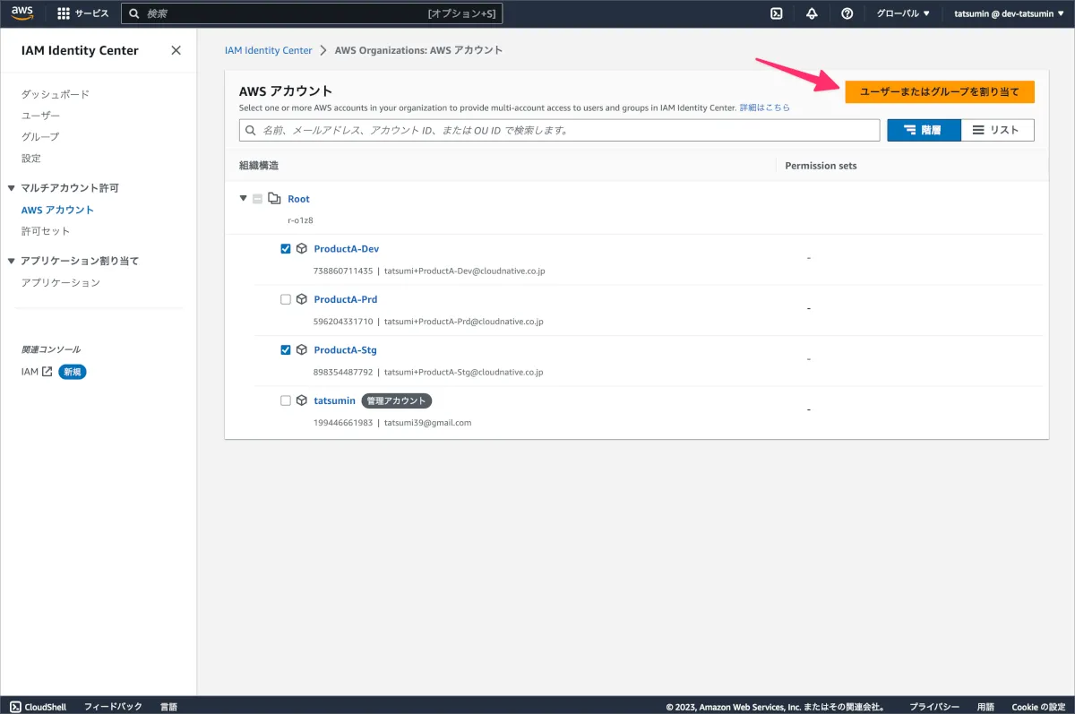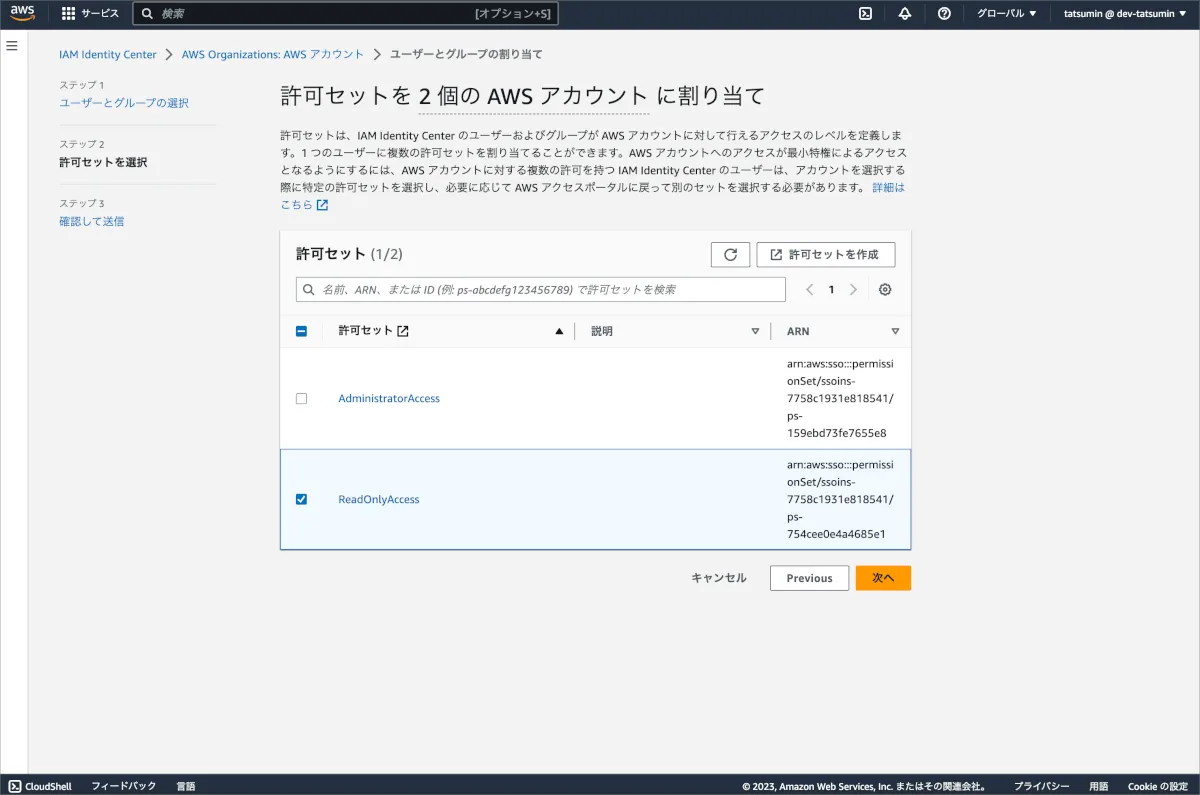 ProductA-Dev, tatsumi+ProductA-Dev@cloudnative.co.jp (738860711435)次にそのAWSアカウントに紐づく許可セットが表示されますので選択し、Enterをします。