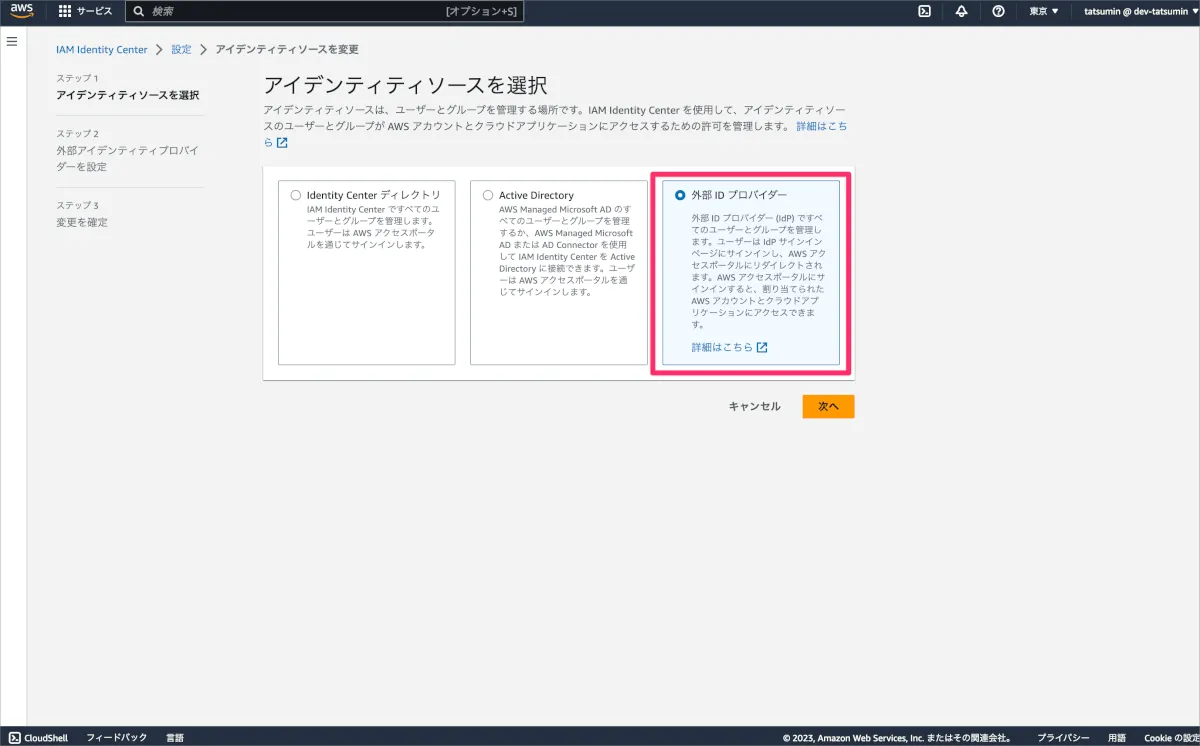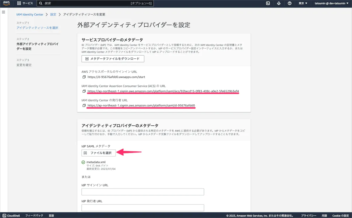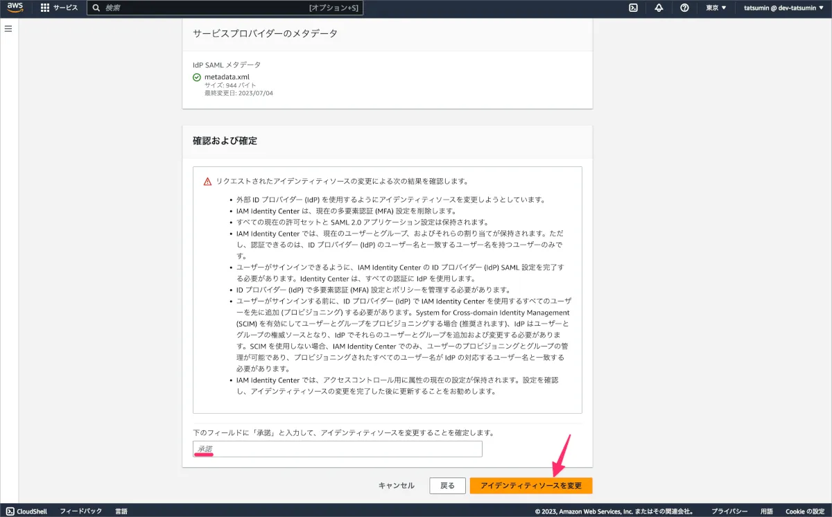 さらにAWS側のIdP SAMLメタデータに手順5.で保存したmetadata.xmlファイルを選択し、次へをクリックします。- 以下の画面で指示に従い承諾と入力し、アイデンティティソースを変更をクリックします。