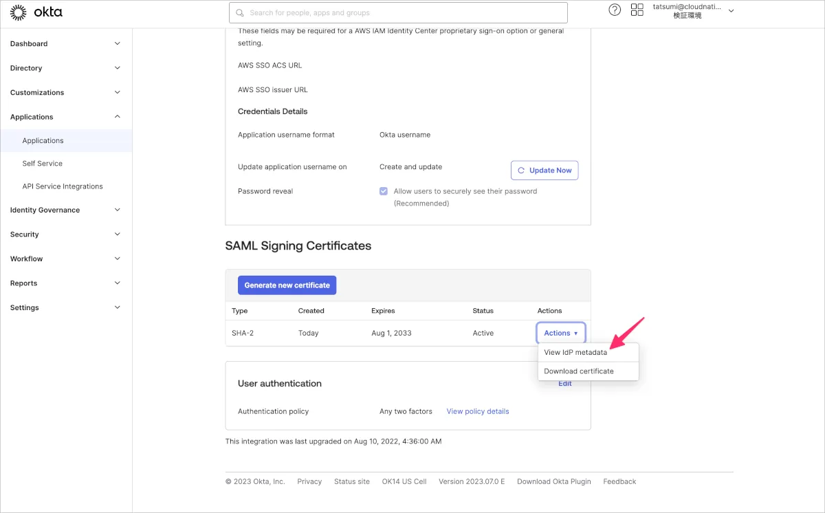 - Sign onタブの下部にあるSAML Signing Certificates内のアクションからView IdP metadataをクリックします。