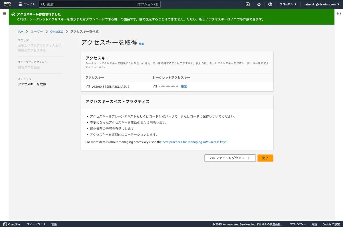 - 表示されるアクセスキーとシークレットアクセスキーを控えておきます。CSVファイルでダウンロード可能なため念の為ダウンロードし、完了をクリックします。