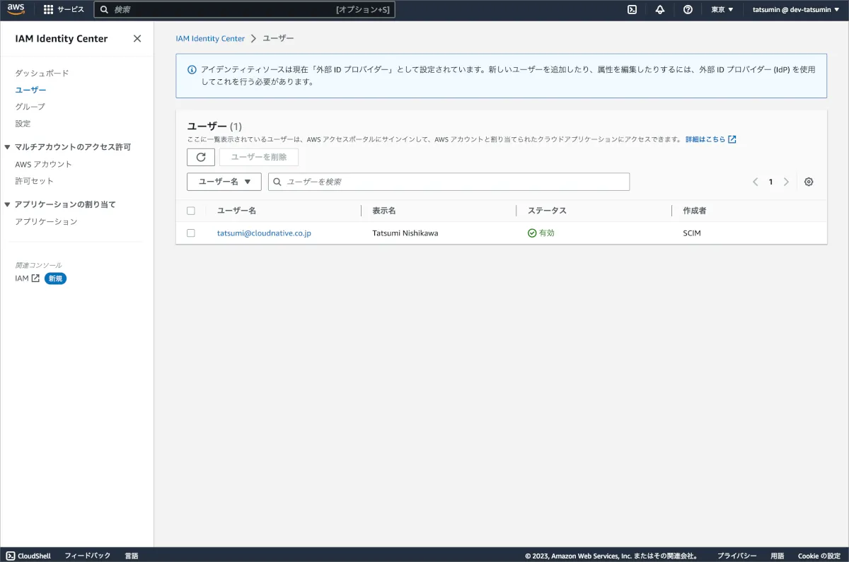 ここまでの作業によってAWS IAM Identity Center上にユーザーやグループは作成されていますが、AWSアカウントとは紐付けされていません。