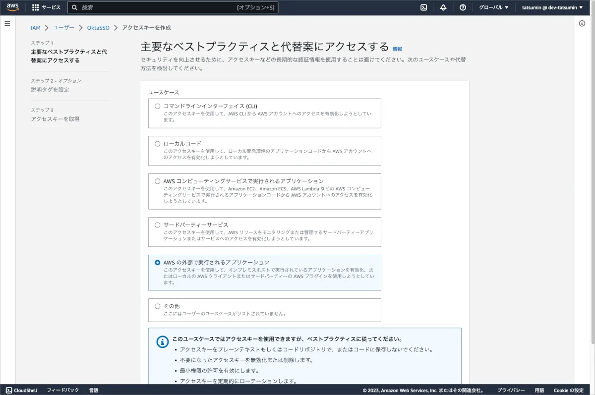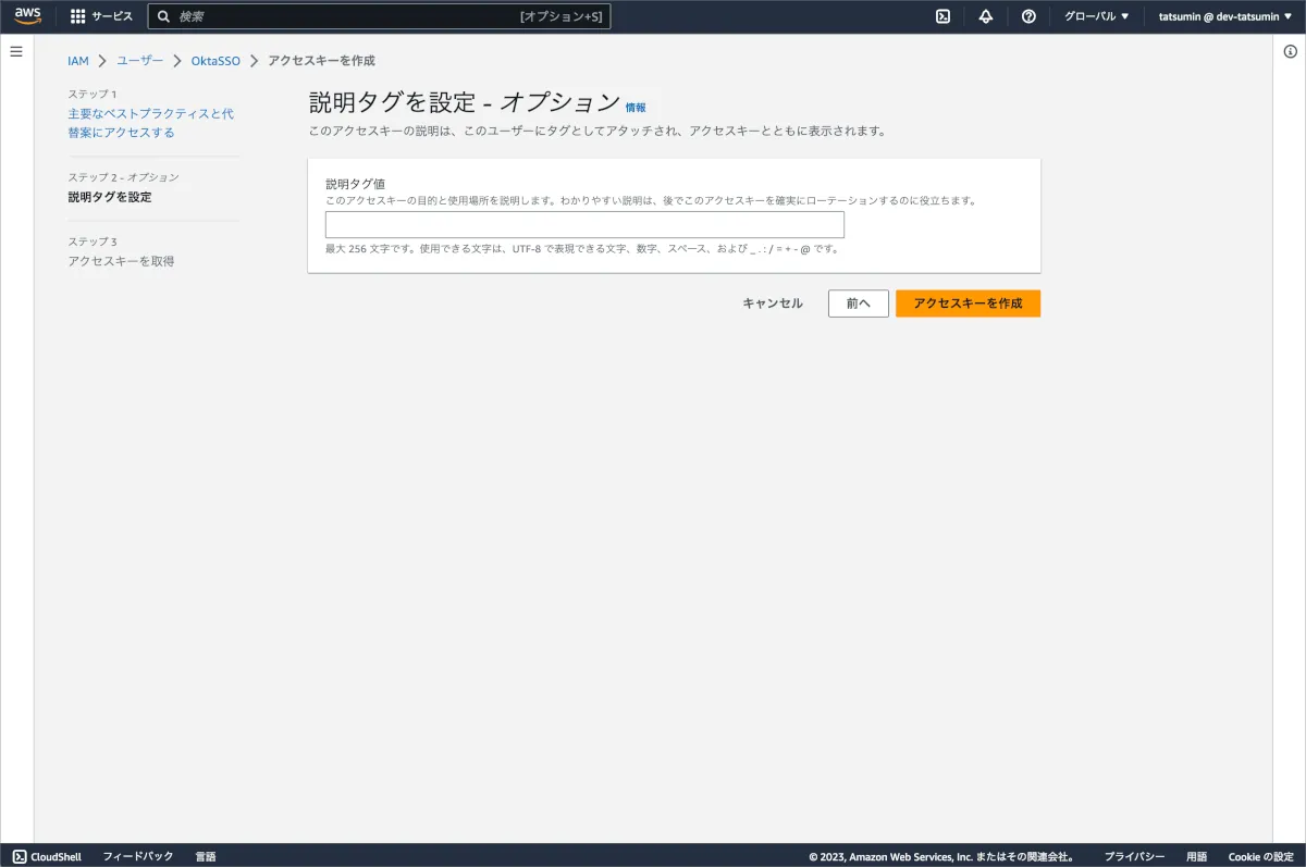 - 説明タグについては必要であれば設定し、アクセスキーを作成をクリックします。