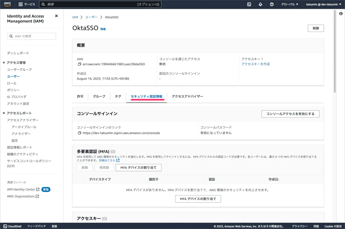 - 作成されたユーザーをクリックし、セキュリティ認証情報タブに移動します。