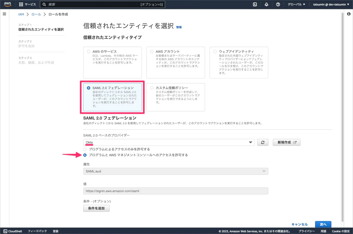 - 信頼されたエンティティを選択でSAML 2.0 フェデレーションを選択し、Oktaを選択し、プログラムと AWS マネジメントコンソールへのアクセスを許可するを選択し、次へをクリックします。