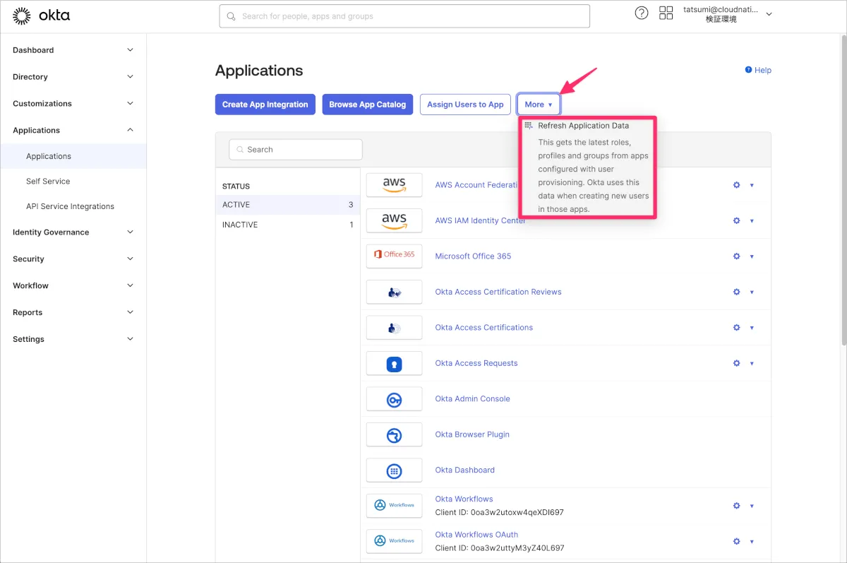 - Okta管理画面でアプリケーションの一覧画面に移動し、MoreからRefresh Application Dataをクリックします。