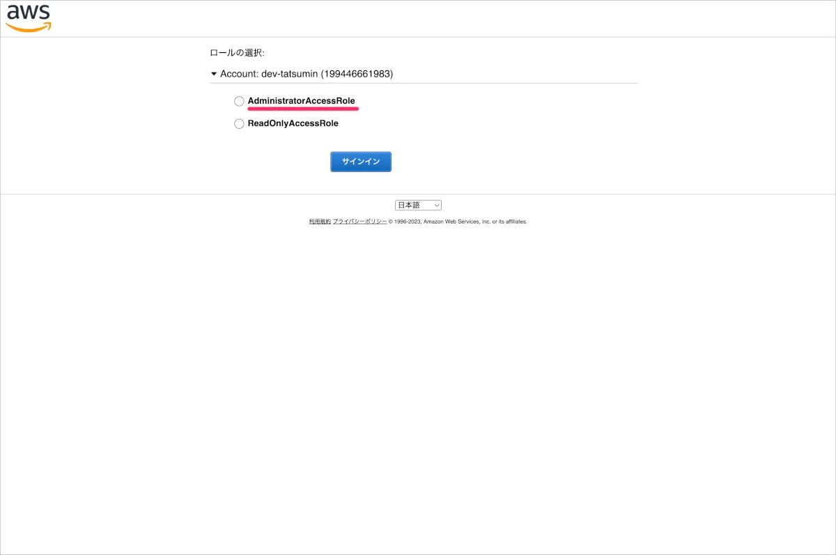 $ aws sso login --profile ProductA-Dev_ReadOnlyAccessサインアウトする場合は以下のコマンドを実行します。