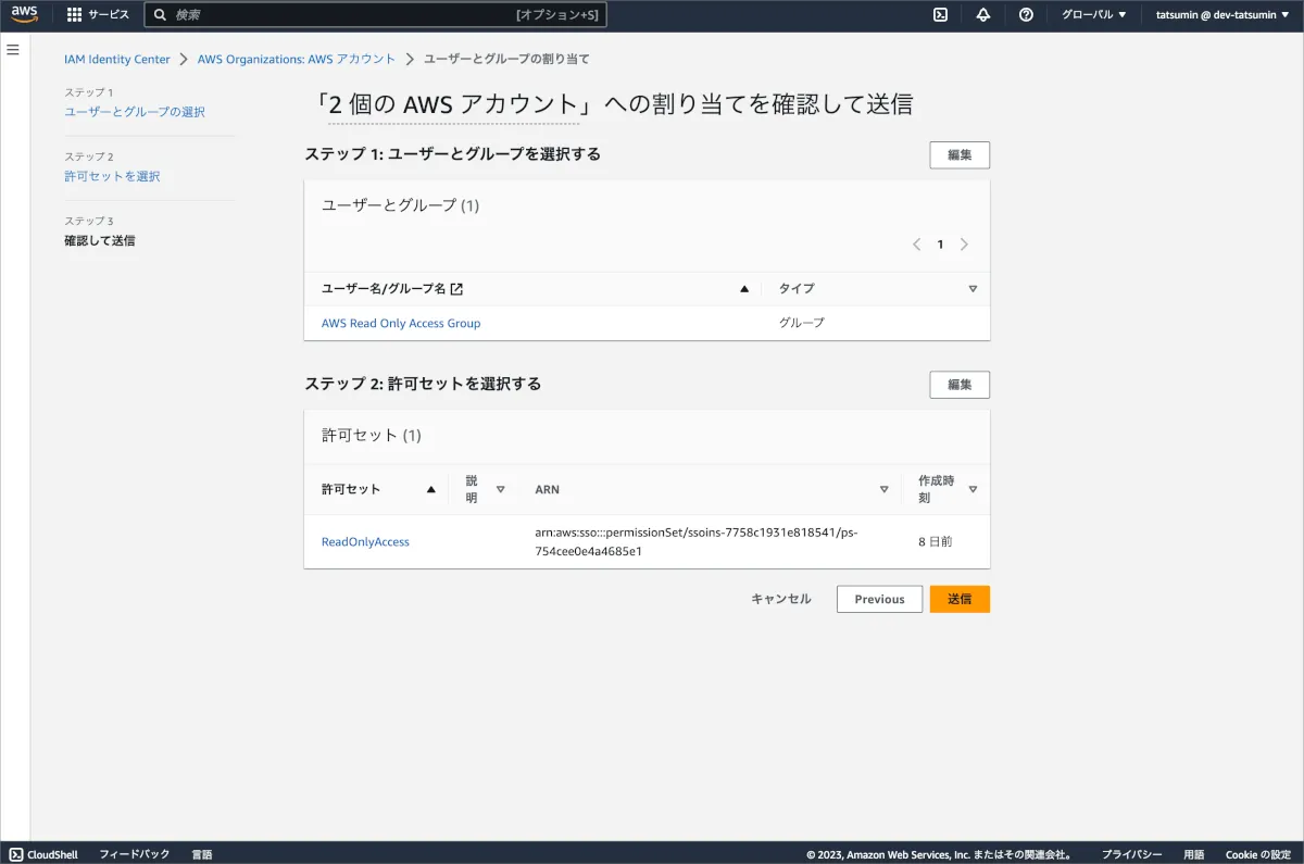 - 手順1.から手順4.までを繰り返し必要なAWSアカウントとグループ(もしくはユーザー)と許可セットの紐付け作業を実施します。