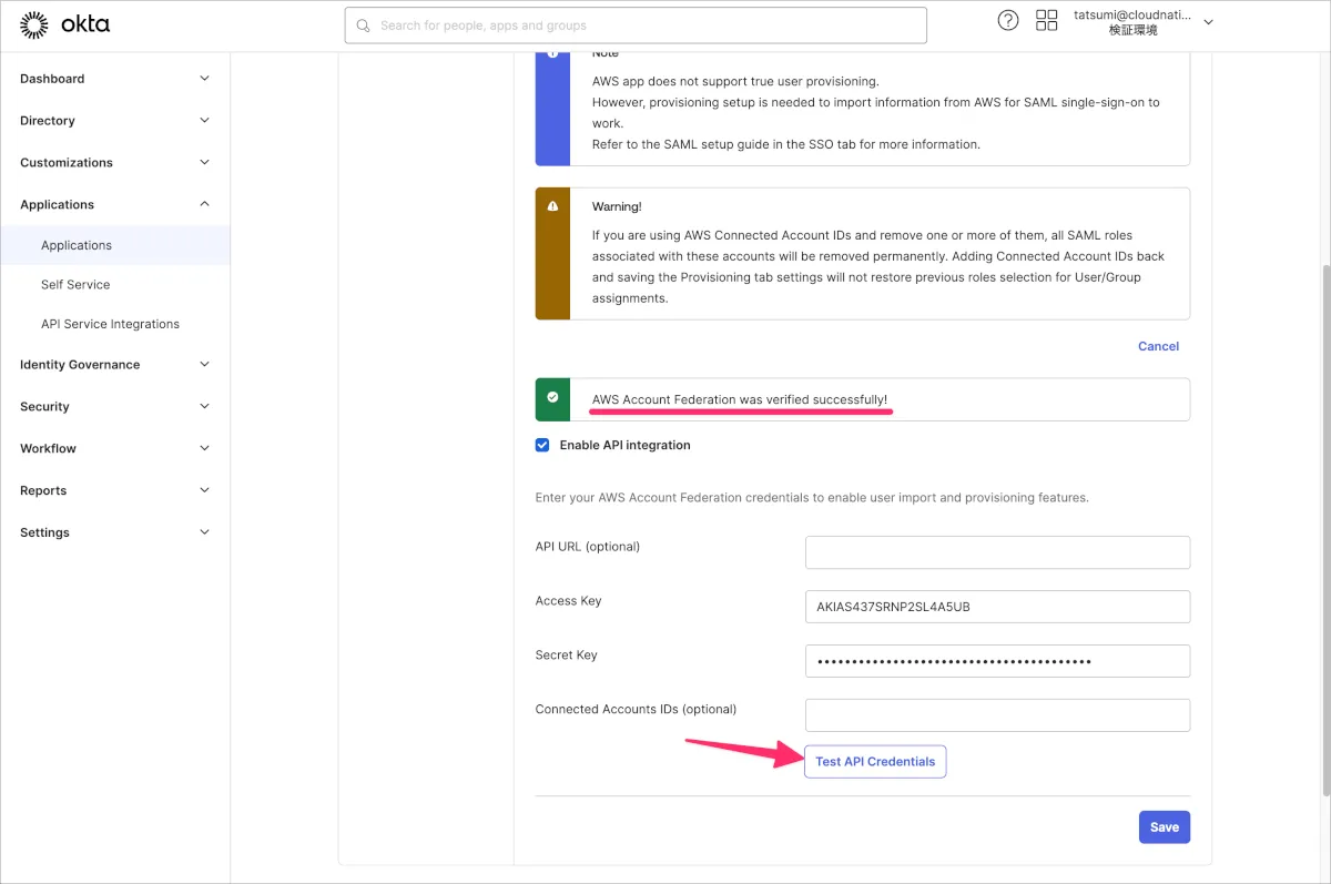 AWS Account Federation was verified successfully!となったことを確認し、Saveをクリックします。
