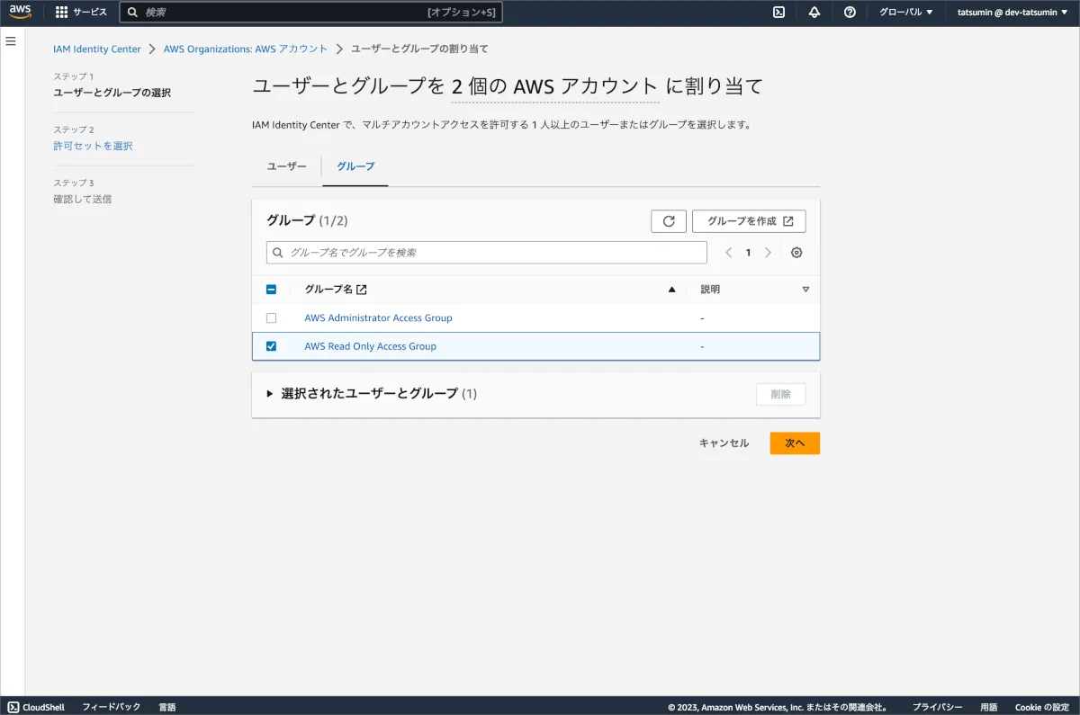 ここでは事前に作成しておいたAWS Administrator Access GroupとAWS Read Only Access Groupという2つのグループを指定しています。