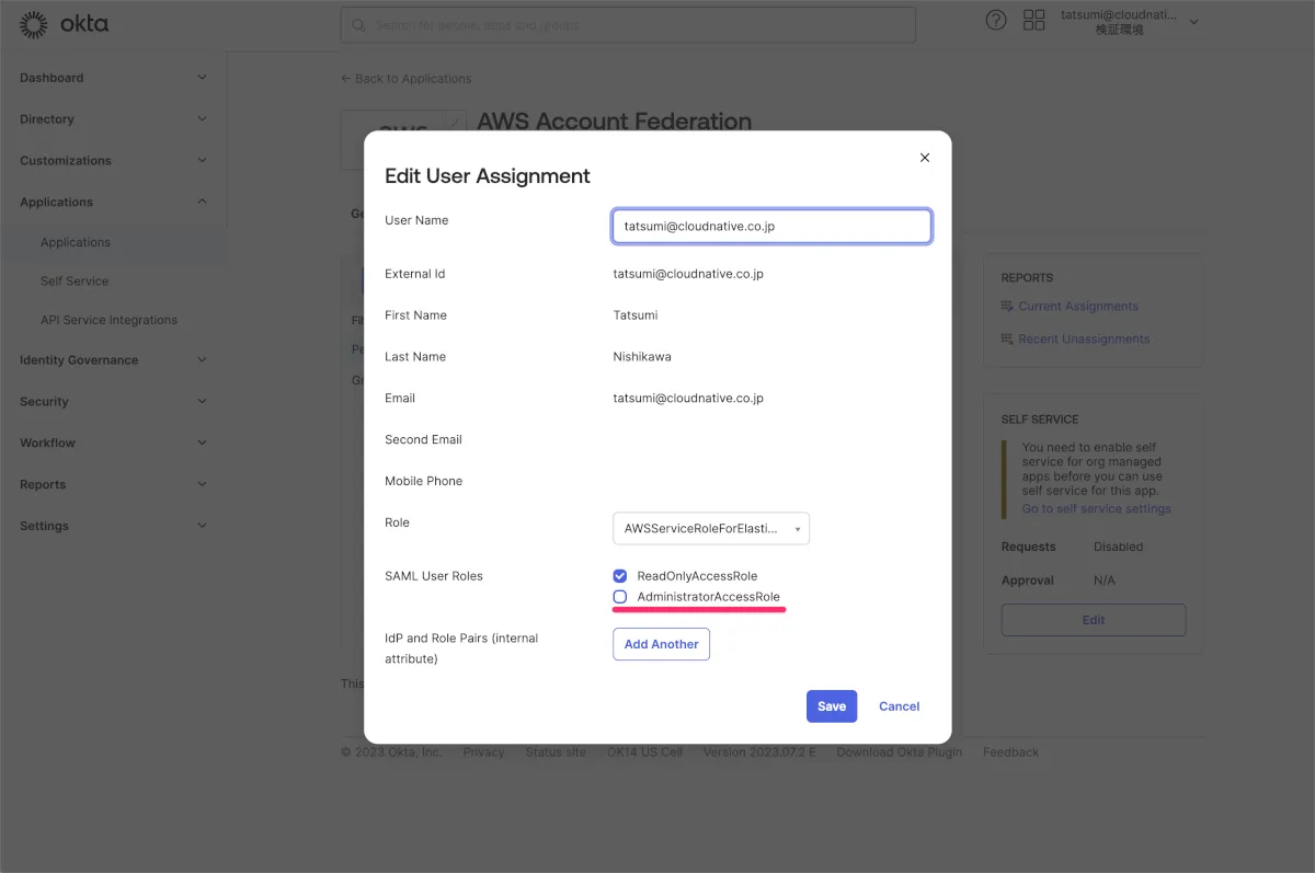 - アプリケーションAWS Account FederationのAssignmentsタブで既存ユーザーの編集ボタンをクリックすると以下のように追加されたSAML User Roleが表示されるようになります。
