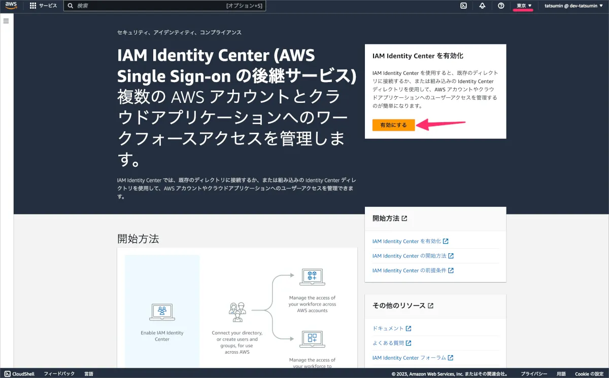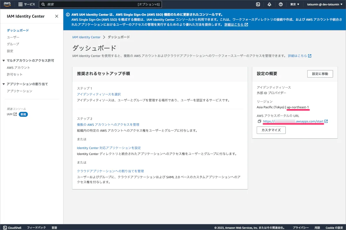 SSO registration scopes [sso:account: access]: sso: account: accessこの時に必要なstart URLやregionの情報はIAM Identity Centerのダッシュボードに記載されている情報を利用します。
