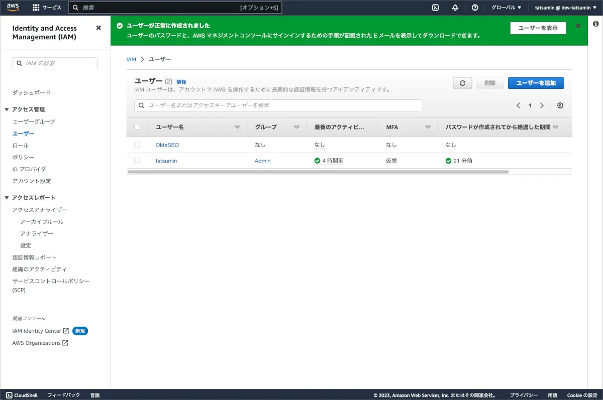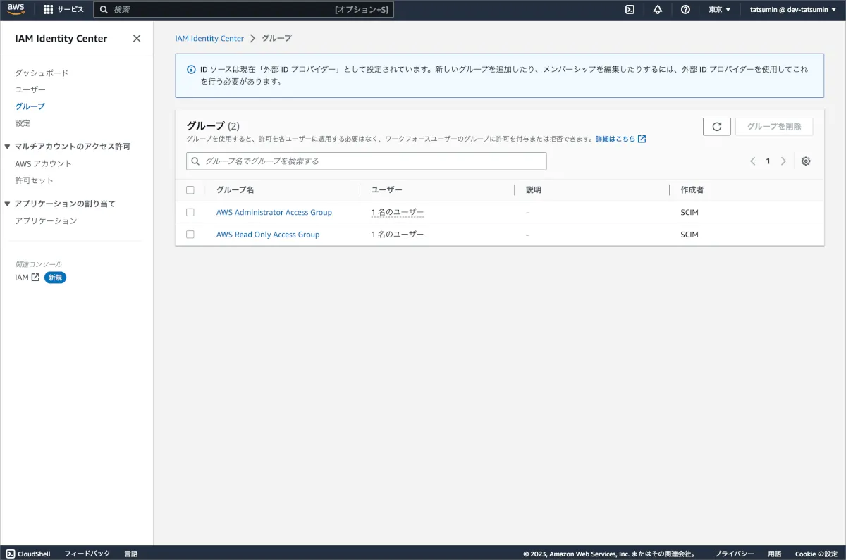 - AWS IAM Identity Center上にユーザーとグループが作成されていることを確認します。