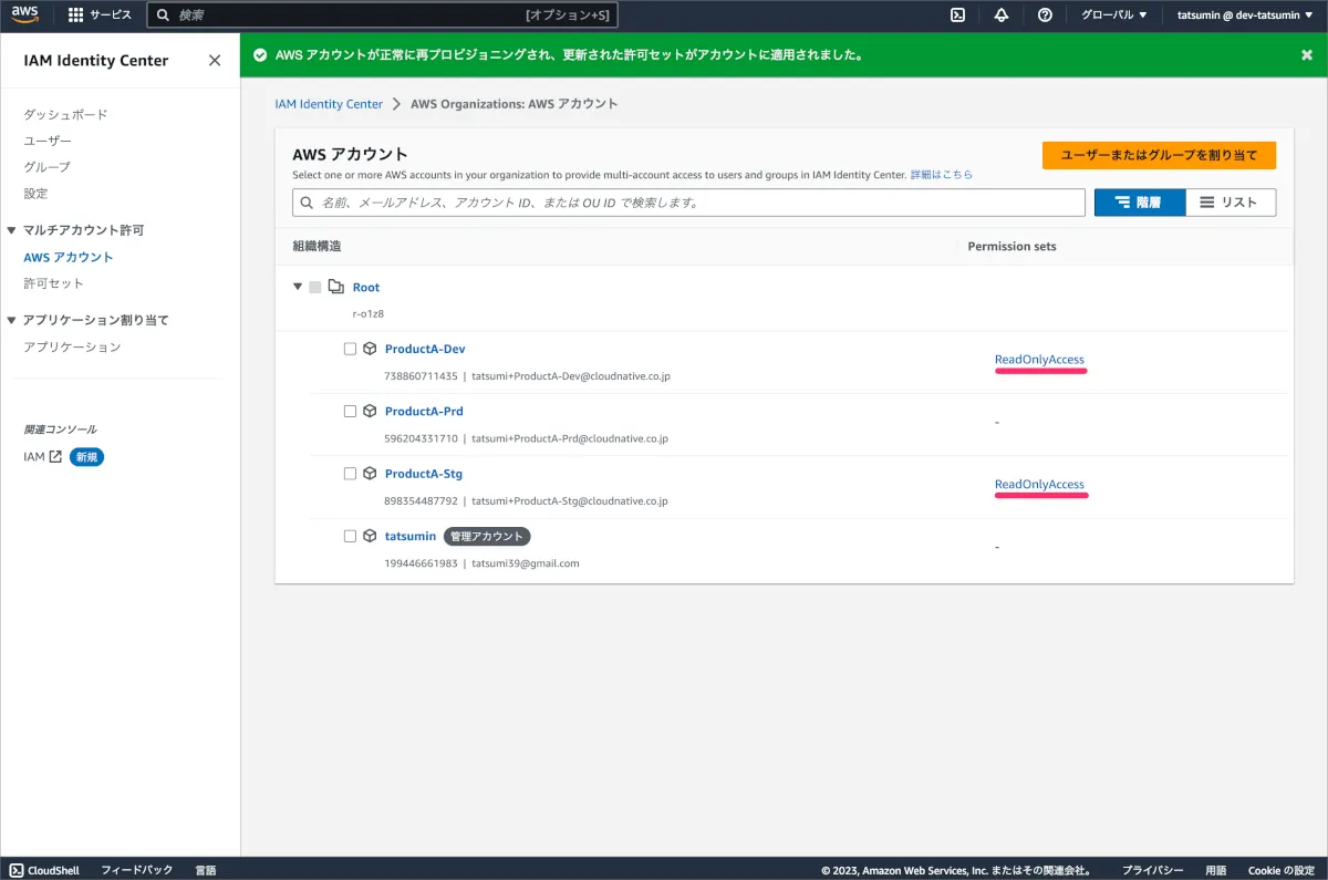 - 以下のようにAWSアカウントに許可セットが適用されていることを確認します。