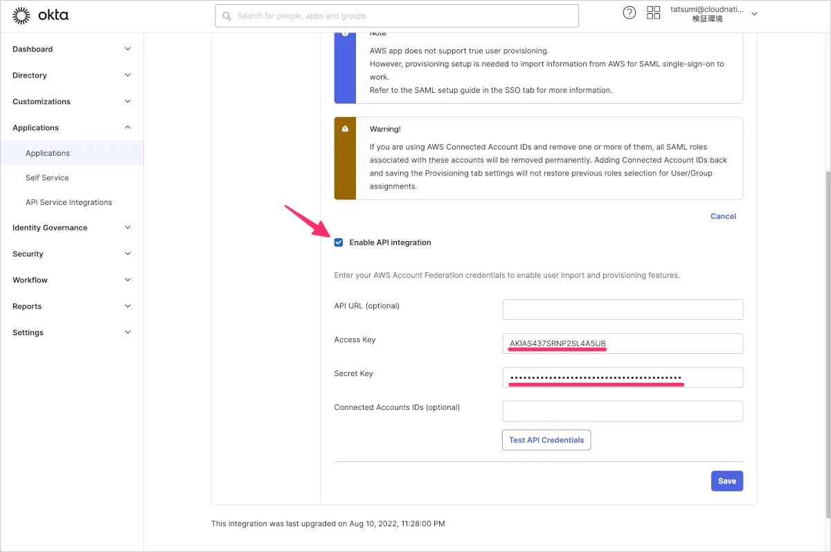 - Enable API integrationにチェックを入れることでAccess KeyとSecret Keyを入力できるようになりますので、API設定の手順14.で控えておいた値を入力します。