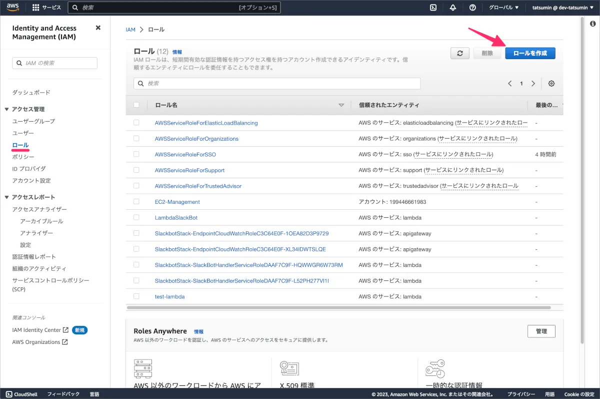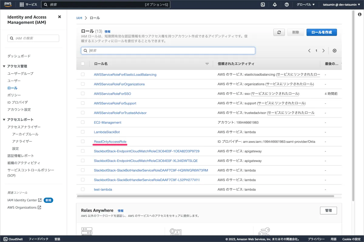 - AWS IAM画面の左側のメニューからロールをクリックし、利用したいロールがある場合はそのロール名をクリックします。