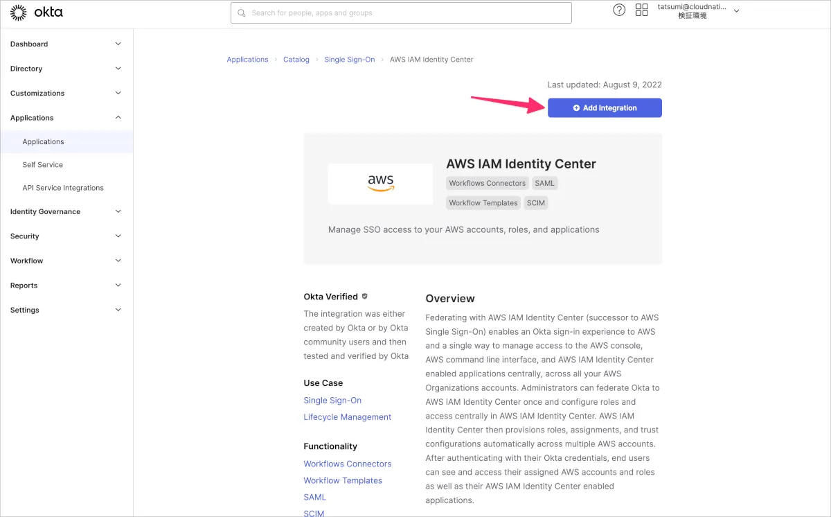 - Browse App CatalogからAWS IAM Identity Centerを検索しAdd integrationをクリックします。